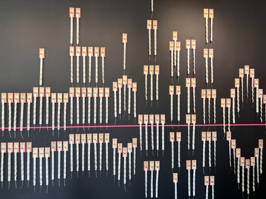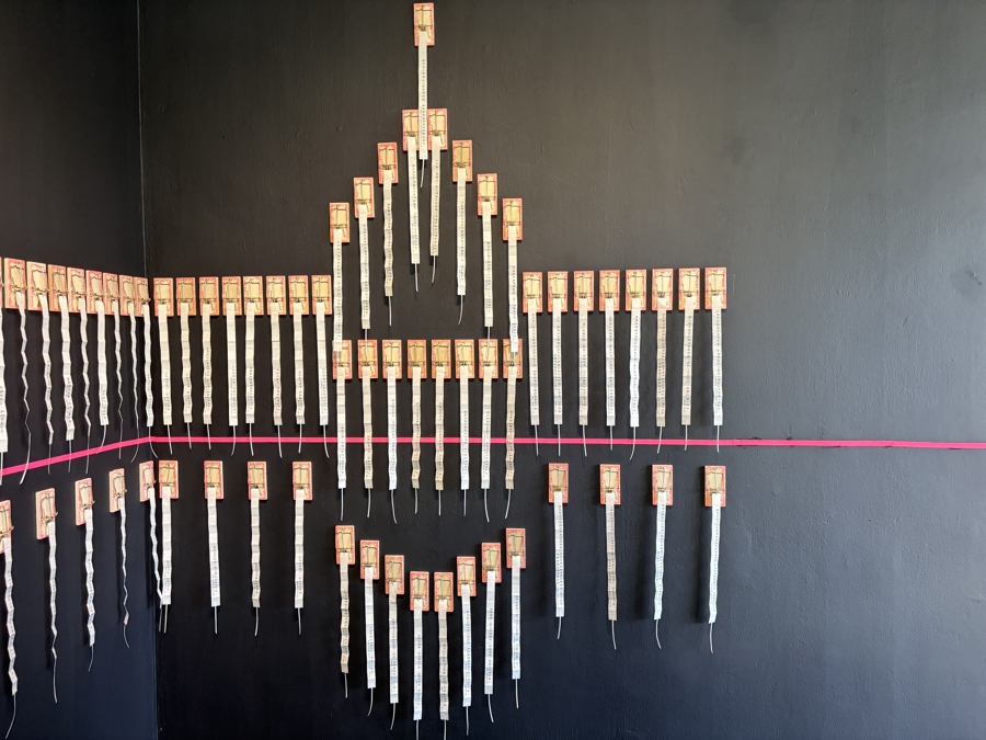 为何展览名为“装饰的城市天际线”?张兰生解释,这200多只捕鼠夹的摆放是有“巧思”的。它们抽象地还原了上海部分地标性建筑的轮廓。比如,陆家嘴“三件套”(上海中心大厦、金茂大厦、上海环球金融中心),位于最高处的一只捕鼠夹,是金茂大厦的针尖。一根“冲天棒”、如台阶般蔓延向下的,则是国泰电影院。
