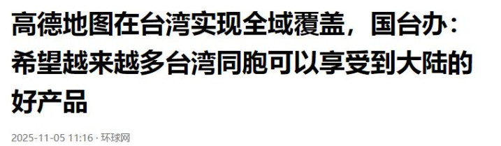 环球网:2025-11-05:高德地图在台湾实现全域覆盖,国台办:希望越来越多台湾同胞可以享受到大陆的好产品