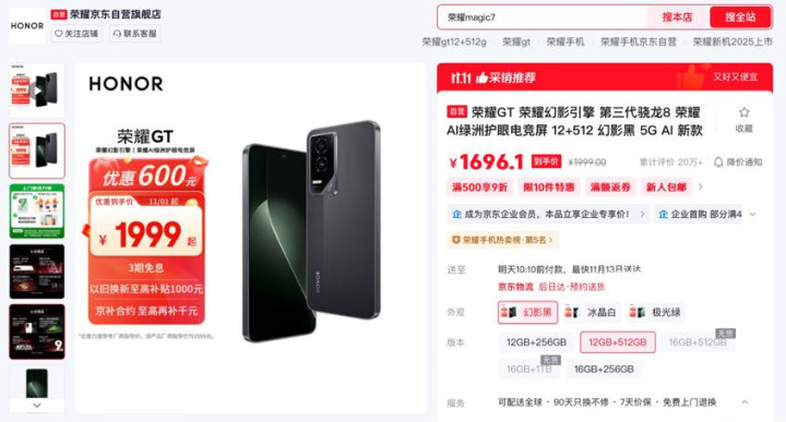 从荣耀某东自营旗舰店来看,12GB+512GB降了很多!从2599元跌到1699元,部分地区甚至还可以叠加国补进一步优惠。