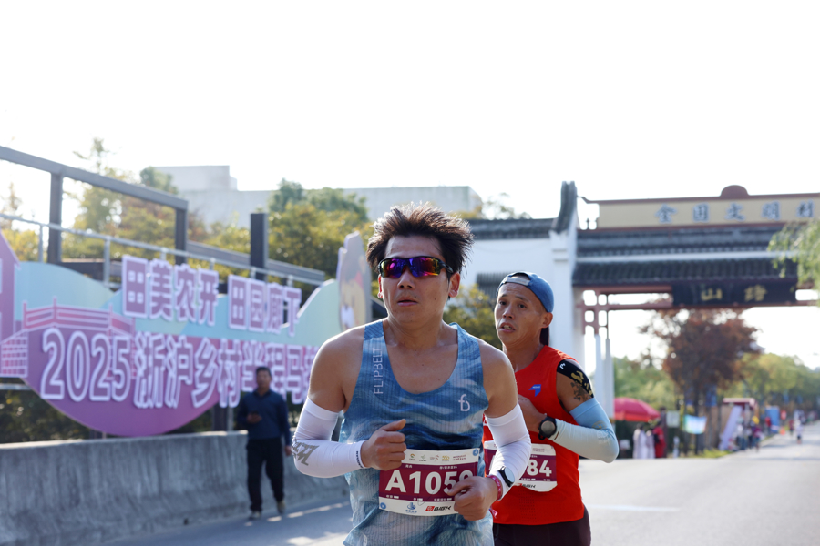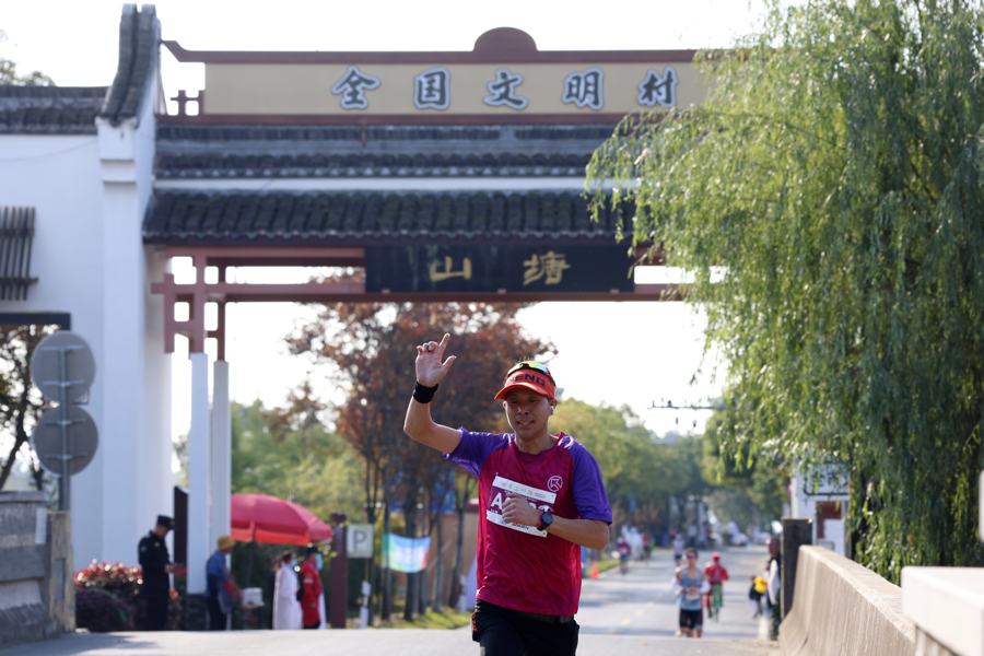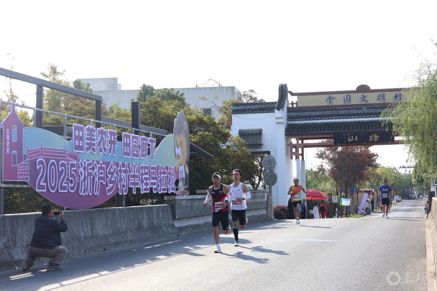 选手们跨过界河桥进入北山塘村,瞬间从浙江平湖进入上海金山境内。