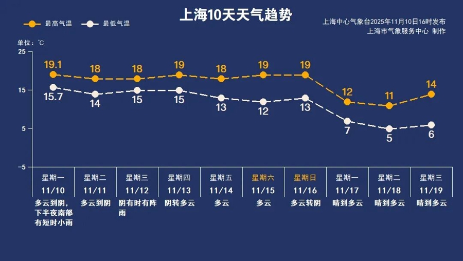 明天(周二),上海仍以多云天气为主,全天气温14-18℃。下半夜起南部地区可能有短时小雨。东北风4-5级,沿江沿海地区阵风6级。周三是本周天气转折关键日,受冷空气和台风“凤凰”外围共同影响,上海将有一次风雨天气过程。雨水主要出现在周三,预计雨量可达小雨到中雨量级。本周后期天气转好,但昼夜温差拉大,早晨气温较低。周末至下周初,在冷空气影响下,气温将明显下降,部分郊区最低气温可能跌至个位数。
