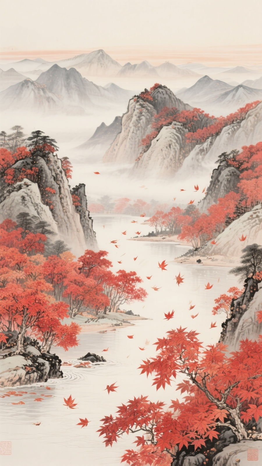 词的开篇,以极简笔墨勾勒出辽阔冷寂的画面。群山连绵,一个“寒”字,奠定了全词清冷的基调,这既是景物之寒,更是词人内心的孤寒。然而,就在这无边的冷寂之中,词人抛出了全词最耀眼的色彩:“相思枫叶丹。”李煜未直言相思如何蚀骨,只说,枫叶红了。“丹”非寻常之红,而是一种如血、如火般的殷红。仿佛是词人心中郁结已久、无处安放的滚烫情愫,在秋风催化下喷薄而出,将漫山遍野的枫林染透。