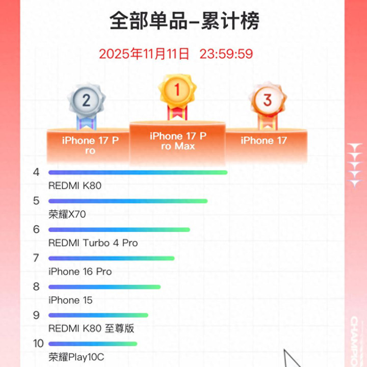 对于双11京东手机单品畅销榜,亓纪的想法是这样的:在单品销量方面,iPhone17系列依旧是遥遥领先,国产旗舰确实还有一定的差距,这个累计榜单就是最好的证明。不过国产厂商预热是有进步的,进入前十的机型不再是百元机,而是主打性能和长续航的千元机,甚至还有1943元的中端性能次旗舰。